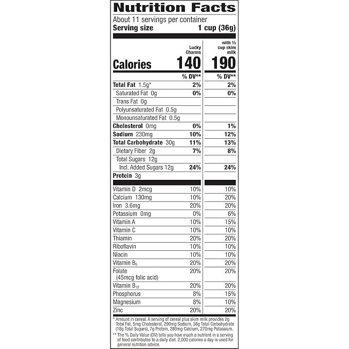 Lucky charms cereal nutrition label. Learn about some of the top cereals sold by US. This cereal contains 11 g whole grain per. The cereal consists of toasted oat pieces and multi-colored marshmallow shapes or marshmallow bits.