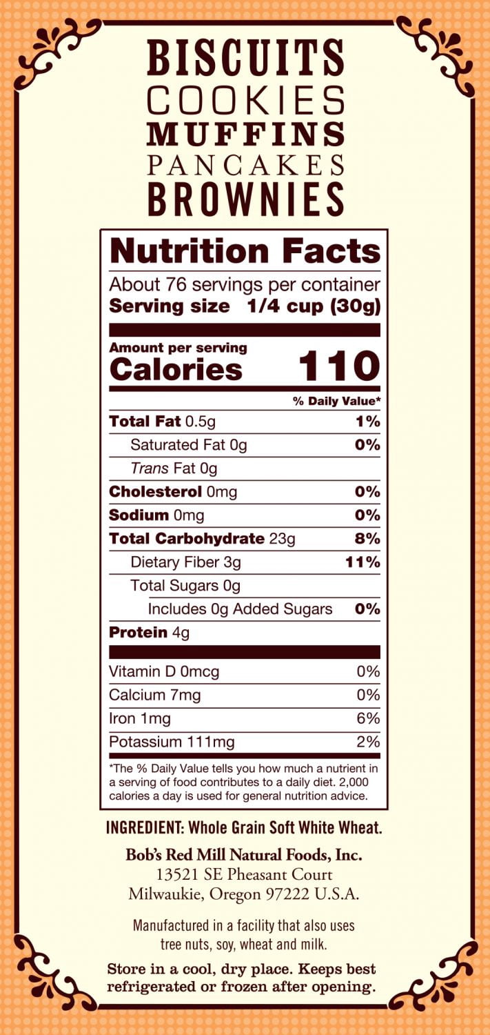There are 110 calories in 1 serving 14 cup 11 oz of Bobs Red Mill Whole Wheat Pastry Flour. For all other uses like cookies cakes pancakes muffins etc. 100 Stone Ground.