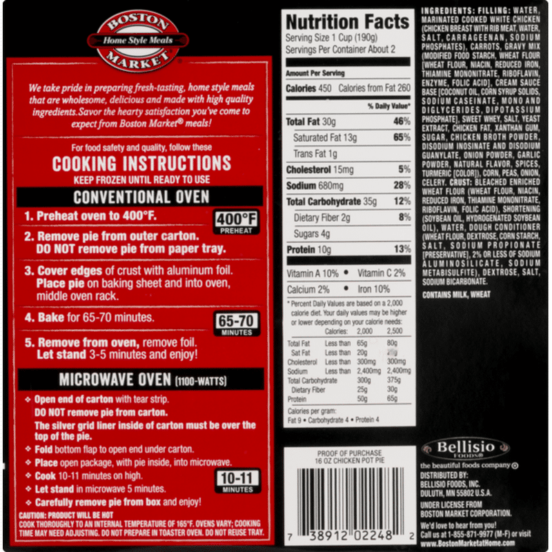 Prices are averaged and may vary between different locations. Get full nutrition facts for other Boston Market products and all your other favorite brands. Bellisio Foods is committed to creating and improving our web content in order to be accessible to all individuals.