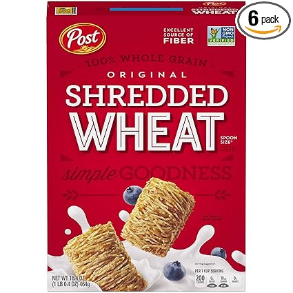 Post Shredded Wheat Cereal Original Big Biscuit 100 Whole Grain No Sugar or Salt Added 15-Ounce Box Pack of 3 15 Ounce Pack of 3 45 out of 5 stars31. A classic favorite Post Original Spoon Size Shredded Wheat is now Non-GMO Project Verified. 0 mg Sodium and 0 g Sugars Very High Source of Fibre Source of 3 Essential Nutrients Good Source of Zinc Phosphorus and Magnesium.